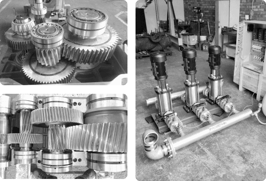 Main Services Include Gearboxes, Bevel and helical, mixers and aerators, slew rings, conveyer drive units, rotating assemblies, winch gearboxes, centrifugal, mono, self-primer, borehole, submersible, double diaphram pumps and archimedis screw pumps, new pump installations with control panels, offsite condition monitoring with machining and milling of components. Electrical motors etc.